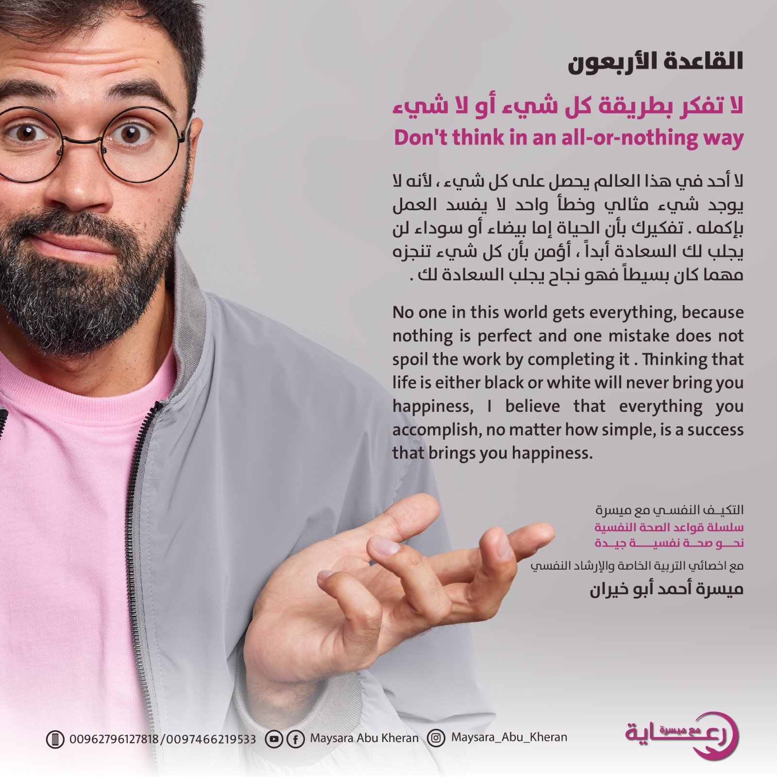 التعامل مع الاضطرابات لا يعني قمعها أو إنكارها، بل فهم جذورها، والتعرف على مسبباتها، والعمل على معالجتها بأساليب واعية ومستدامة. كل اضطراب هو فرصة لإعادة اكتشاف الذات، واكتساب أدوات جديدة للحياة، والانتقال إلى مرحلة أكثر نضجاً واتزاناً."